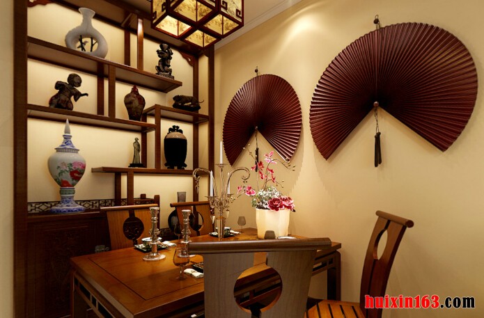 餐厅的设计温馨浪漫还充满着古典韵味的惬意性,实木的框架存在为餐厅的装饰带来一道独特的风景线,实木的餐桌椅的搭配更具有一致性的装修意义,一个实木雕刻印花的吊灯的使用瞬间提升了空间的温馨舒适感,墙面上两幅扇子造型的打造为空间的整体装饰感带来更多的诠释和展示。