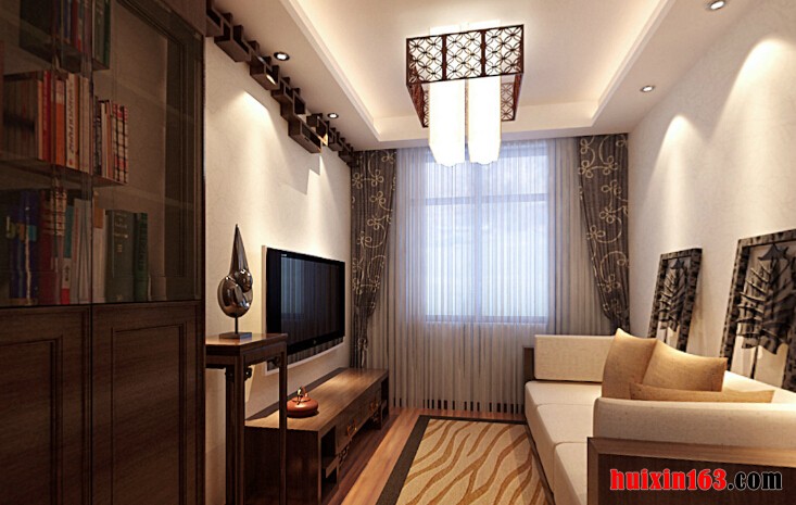 客厅的整体装修空间比较迷你,白色的石膏板吊顶装置不加任何的复杂修饰,嵌入式的射灯和中式的独特吊灯的使用加深了空间的温馨气氛和开阔的视野,白色的墙面装饰让客厅的气氛更加的明亮舒适,实木地板的使用搭配地毯更加展示出客厅的舒适和时尚前卫之感,电视背景墙采用了最原始的白墙面做底面修饰,上方的实木雕刻的周围装饰给电视背景墙的立体感带来更多的展示,白色的沙发装饰更是空间的大气明亮气氛更加的充分。