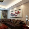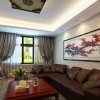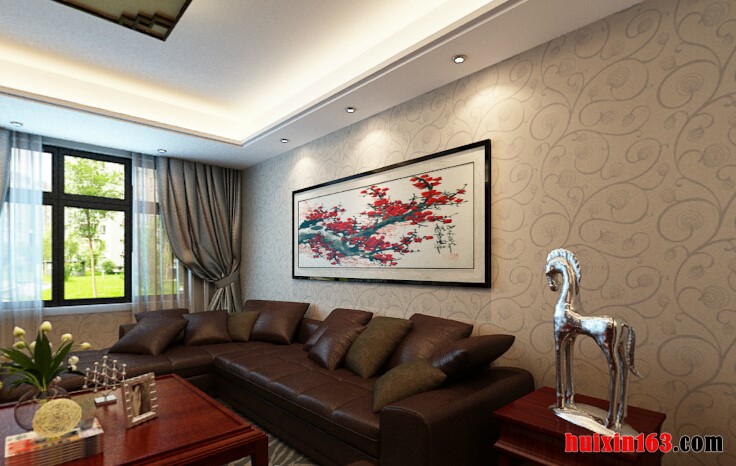 客厅的装饰比较简约大气,白色的石膏板吊顶设计搭配上中式的灯具让空间的延伸感提升的同时更具有中式古典的韵味,深色的皮质沙发的使用加深了客厅的稳重感,保温形式的地毯铺设瞬间把地面的装饰新意提升到最高,沙发背景墙的设计简约又大气,白色花纹的墙纸铺设搭配上一个大型的玻璃边框的梅花装饰画把主人品位提升的同时,还从一定意义上为客厅的整体装饰感带来更多的诠释。