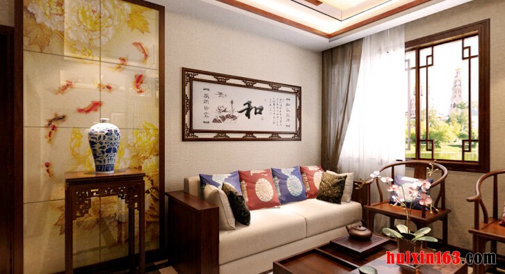 客厅的整体装饰产生的中式古典韵味比较强烈,白色的石膏板吊顶加上实木框架的打造产生的立体装饰感比较突出,白色的墙面上加上实木的贯穿装饰给人一种整体的中式装饰感,白色的沙发和实木框架的打造再拥有几个颜色各异的抱枕装饰产生的中式大气氛围比较浓烈,沙发背景墙的一个大型的和字装饰让主人的生活品味和修养有很大的提升,隔壁墙面采用瓷砖装饰画的打造不仅让空间的气氛更加的富丽堂皇,电视背景墙的设计采用的是整体的实木框架雕刻形成的,和餐厅的区域形成一墙之隔,这种装修的手法更具有中式古典的装修韵味。