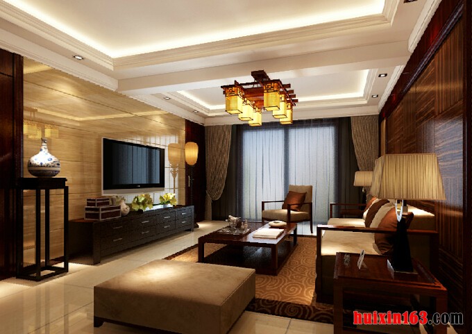 客厅的整个装饰着重点在实木装饰上,实木的桌椅和实木的装饰手法都让客厅的整体环境更加的舒适和大气,白色的石膏板吊顶装饰加深了空间的通透和延伸感,一个大型的中式吊灯的使用更是让空间的环境温馨和惬意,白色的瓷砖地面装饰和中式的花纹地毯搭配更具有复古的气息,白色的沙发和实木的框架运用形成的一致性的装修气息比较浓烈,电视背景墙的设计采用了明亮的实木装置打造出来的,加上两边对称的实木装置让客厅的打造更具有对称性。
