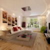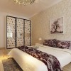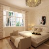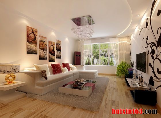 现代简约的装修风格给人的时尚舒适感是非常明确的,客厅的整体装饰奢华气氛比较浓郁,白色的石膏板吊顶装饰搭配上一个靓丽的水晶吊灯让空间的温馨舒适感更加的突出,白色的实木地板的使用增加了空间的舒适氛围,整套的白色沙发的软装搭配上颜色鲜艳的抱枕装饰为客厅的颜色装饰带来一抹靓丽的风景线,沙发背景墙上四副独特的装饰画的悬挂瞬间把客厅的装修档次和主人的生活品味提升到最高的区域,电视背景墙的装饰采用了白色地面黑色花纹的装饰壁纸进行全面铺设的,产生的整体立体装饰感比较完善和独到。