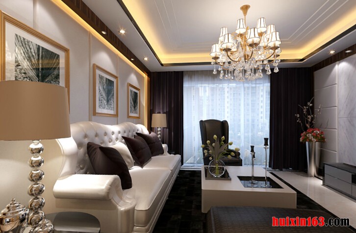 客厅的装饰给人眼前一亮时尚前卫的印象,白色的石膏板吊顶装饰搭配上嵌入式的射灯以及实木边框的打造让顶面装饰更加的具有立体感和温馨舒适感,大型华丽的水晶吊灯的使用提升了空间的装修档次还为客厅营造出更多的温暖气氛,白色的皮雕家具和深色的抱枕搭配起到很冲击的视力效果,黑色的大面积地毯的铺设让空间地面的立体感更加的突出,沙发背景墙上的三幅装饰画不仅起到相对性的设计理念,瞬间把中式的装修韵味展现出来。